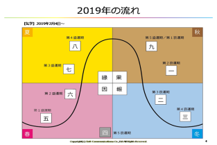 僕は以前から九星気学を学んでいます。 その知識を使って、みんなの星を見て1年の傾向を話していたのですが、 いつからか「社長の占い」という 年始会で行う恒例行事になってしまいました。 九星気学によると、9年周期で人のバイオリズムが変わります。 大きくは春夏秋冬に分けられて、 春なら、タ…