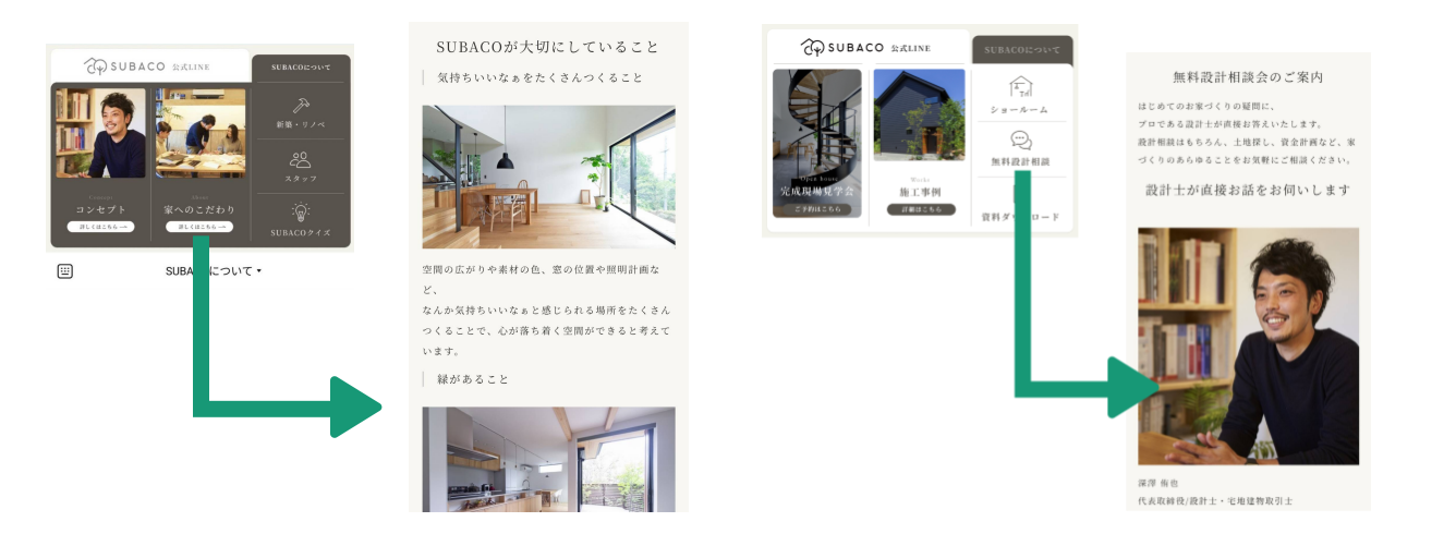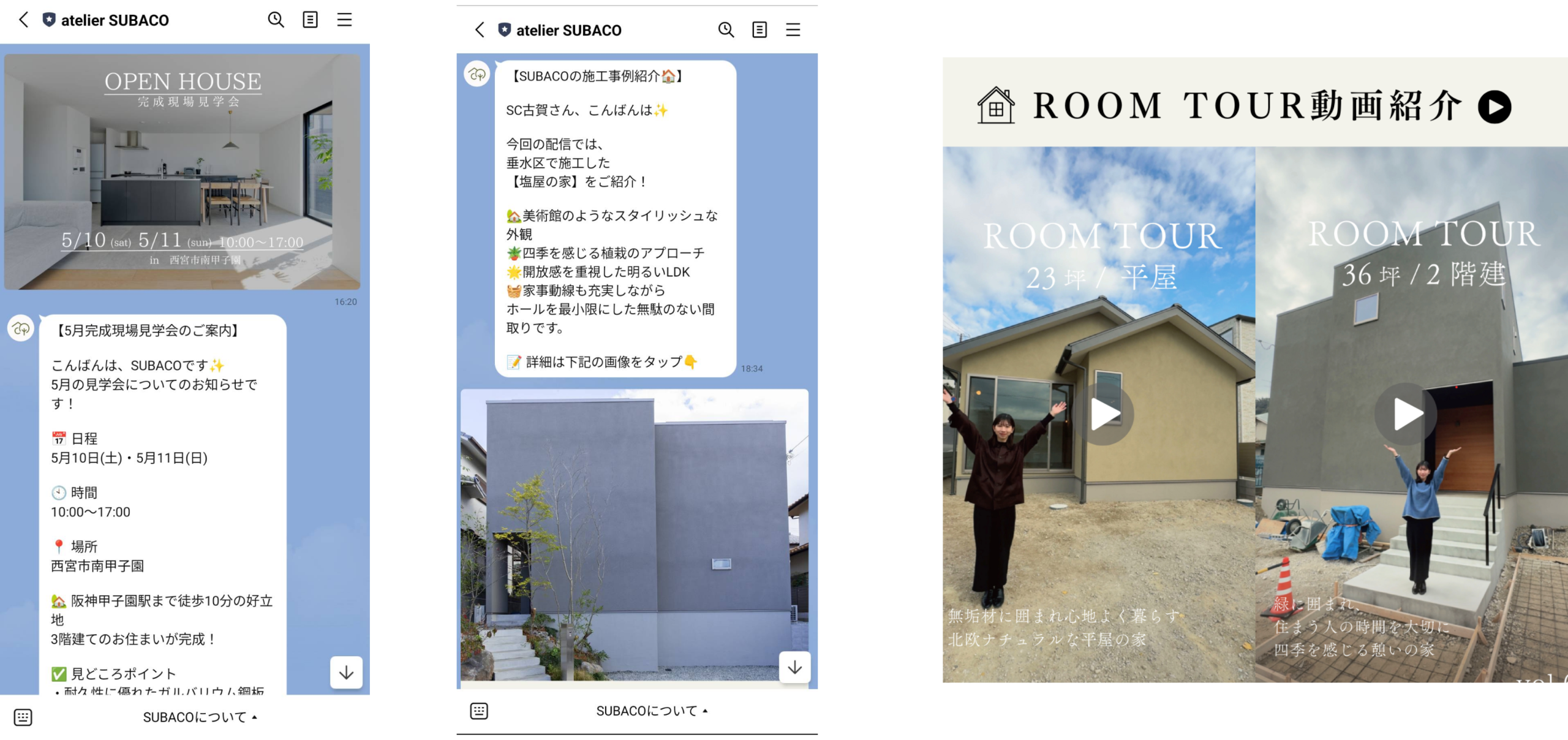 見学会の案内や施工事例の紹介など、Lステップの機能や動画を使いながら、配信しています。